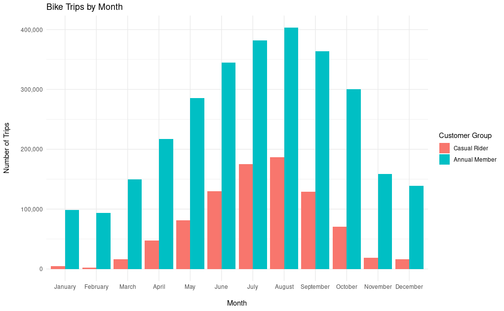 This bar chart is quite revealing about the behavior of casual riders. Annual riders tend to use the bike share service consistently across the entire year. There is an obvious rise through Spring and peak in late Summer. However, casual riders use the service significantly less in the Winter months compared to annual riders. Like the annual riders their usage rises through Spring, peaks in Summer, and drops in Fall.