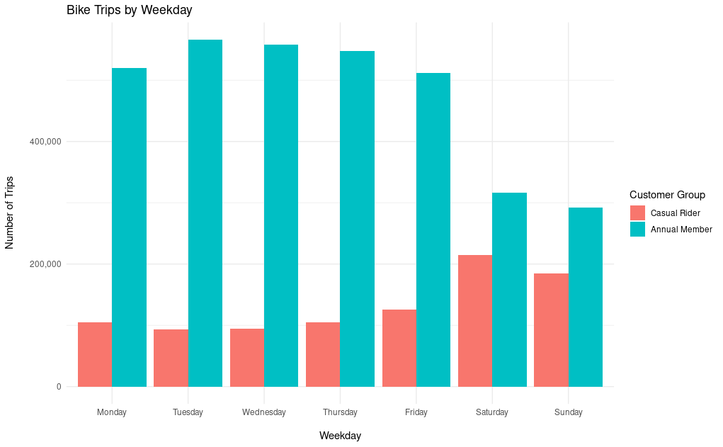 From this bar chart we can compare the trends in each customer group by the weekday. We see that the number of casual riders increases on Friday, peaks on Saturday and Sunday, and then hits a low during the middle of the workweek. The annual rider usage is the inverse. Usage peaks during the middle of the workweek, and it sharply falls to a low on the weekends.