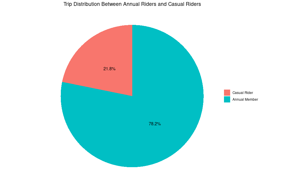 Through my analysis I was able to find several differences in the behavior of annual members and casual riders. Firstly, I found that casual riders are responsible for significantly less of the total number of bike share trips. In fact, casual riders accounted for only 21.8% of total bike trips. Meanwhile, usage by annual members was over three times higher and accounted for 78.2% of total bike trips.